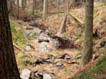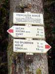A pomalu jsme byli u Trenckové rokle. Trochu jsme to zvoslili, dali jsme si pauzu, těsně před roklí. Ťapinka šla na průzkum, vrátila se za chvíli, že je to jenom kousek, že tam byla na kraji. Nechali jsme jí tam bágly a šli se podívat s Vlastíkem. A našli jsme tam velice pěknou rokli, s rozcestníkem a povídáním o Baronu Trenckovi a spoustou skal a potůčkem a malejma vodopádkama. No jo, jenomže to Ťapina z kraje vidět nemohla, tak se Vlastík zase vrátil k báglům a poslal ji za mnou, aby si to taky prohlídla. Tak jsme tam furt lítali jak idioti tam a zpátky. Nakonec jsme se tam vystřídali teda všichni. A jak jsem tam čekal na Ťapinku, dovalila se s ohromným nápadem - s Vlastíkem prý přišli na to, že zpátky půjdeme po druhým břehu, když už to na tomhle známe a když už jsou na tomhle břehu skály, na kterých Ťapinky víznou (nebo jak je nedokonavý vid od slovesa "uvíznout"?). Že buď přebrodíme, nebo si hodíme přes nějaký užší místo kamínek nebo klacík. Pro neznalé - "kamínek" je v naší interní terminologii s Vlastíkem tak půlmetrákovej balvan a "klacík" je kódové označení tak pro šestimetrovou kládu. Mně se ten nápad až tak nezamlouval, přece jenom, na tomto břehu jsou skalky, na kterých Ťapinka dělá "Uíííí", ale na druhým víme lautr prd, co tam vlastně je, navíc mezi tímto a druhým břehem je voda a nikde není psaný, že z něho tentokrát někdo neshučí. A k dovršení všeho si Ťapinka zkoušela přechod na vyvráceným stromě a dělala "Uíííí" i tady. Zasekla se, stála na kládě jak hydrant a dalo nám hodně práce ji dostat dolů.