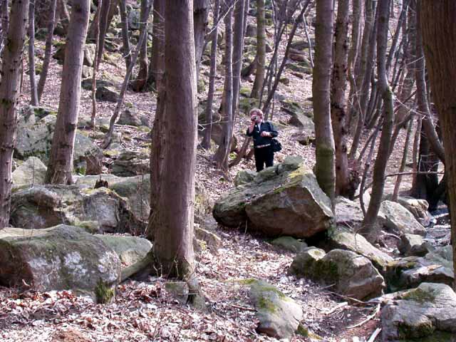 Nadešel čas, kdy jsme chtěli vyrazit. Samozřejmě se to neobešlo bez dalšího varietního Ťapičísla - šla umýt ešusy. Vrátila se s mokrou nohou. Už se z toho stává taková pomalu tradice - někam jedem = Ťapinka spadne do vody. Ale co už, bylo teplo, stačily (moje) náhradní suchý ponožky a šlo se. Chtělo by se říct, že se šlo i vesele, jenomže to by nesmělo bejt takový to nahóru a dólu, ještě lépe - nahóru skála a dólu skála. To se Ťapinkám ale vůbec nelíbí. Však tam taky tajtrlíkovala jak zjednaná. Původní předsevzetí - dojít až do Moravského Krumlova - vzalo zasvé v Tulešicích. Prostě se nám už nikam nechtělo. A kam se taky honit, že? Mrkli jsme na jízdní neřád a zjistili, že autobus by měl jet za hodinku a čtvrt. Pohodlně jsme se vyvalili u zastávky, že se nakrmíme, Ťapinka cynicky sežrala Tatranku uvázanejm psům před čumákama, když tu, asi po deseti minutách, přichvátal jakejsi chlapík, s taškou přes rameno, suverénně se postavil na zastávku a vypadal, že ví, co asi tak dělá. Zalovil jsem v paměti, ano, jaro, začátek dubna, spousta ujíždějících spojů, to už jsem někdy zažil. I vstal jsem a chlapa se zeptal, jestli se náhodou, nepatrnou, málo pravděpodobnou, ale přece jenom čistě teoreticky možnou náhodou - neměnil čas? A vida. Měnil. Autobus už byl slyšet v zatáčce. Rychle jsme sebrali saky a paky a ostatní propriety, nastoupili a do Moravskýho Krumlova vcelku pohodlně dojeli.
