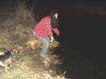 ze srázu do polozamrzlé řeky. No a na druhé straně je tábořiště, v létě tam stojí tábor, tak tam jsme si pod velkým smrkem postavili stan, uvařili a najedli se. Ťapinka se rozhodla i hygienu provést, ono to sice vypadá, jako by se chtěla do té vody vrhnout, ale není to tak, skutečně si jenom myje ruce: A na závěr dnešního pokračování jeden pes přírodní, u ohně sedící: