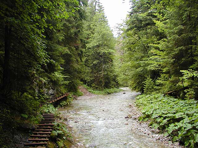 Překračujem Hornád a jdeme údolím Bieleho Potoka, ten jsme loni jenom míjeli. Začíná chvilkama poprchat. Berem pláštěnky a jdem furt dál. Jo, hezkej ten Bílej Potok, dobrá polovina se jde po horizontálních dřevěných žebřících a vypadá to tam moc krásně. K tomu přispívá i to, že potkáváme minimum lidí. Možná kvůli té bouřce ráno a dešti teď. Tím líp. Poslední dvě ženský potkáváme v ústí Sokolí Doliny, kam máme vlastně celej ten čas namířeno. Ty dvě vypadly z údolí a tváříc se hodně zvláštně daly se na ústup zpátky. Divné, je to jednosměrka, podle všeho narazily na něco, co se jim muselo ukrutně nelíbit, tak to vzdaly.