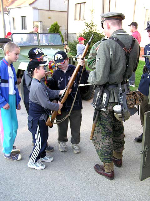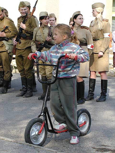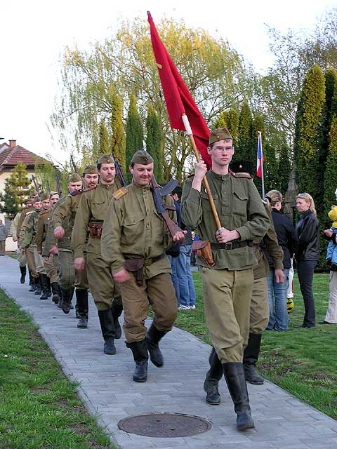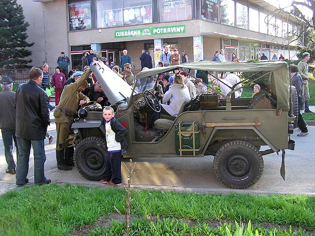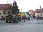 Po exhibici v Brně na náměstí Svobody následovala další expediční část, když už je kolona na cestě, proč toho nevyužít a neudělat spanilou jízdu po okolních dědinách? Má to několikero důvodů - krom propagace a šou pro obyvatele si to tamější spřáhnou ještě s položením nějaké té kytky či věnce k pomníčku u příležitosti osvobození, ta část aktérů, jež představuje ruské jednotky, jim k tomu udělá stafáž, čestnou salvu a takový ty vopičky, vono je to pak barvitější a líbivější. Za to vyfasuje obvykle něco málo vod jídla a pití a všici jsou spokojení jak želvy.