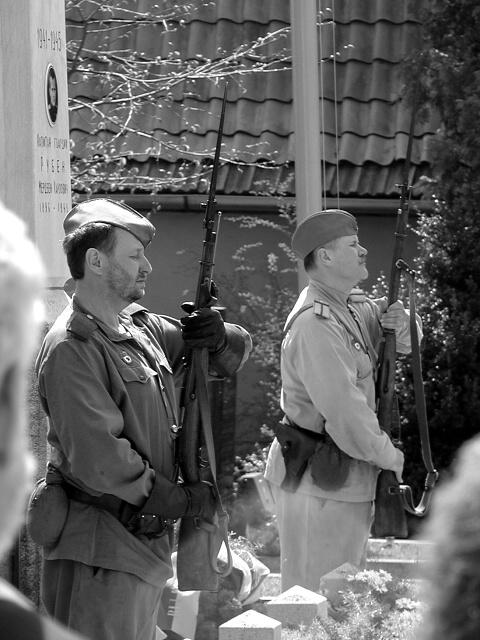Tradiční sobotní pietní akt u pomníku v Ořechově. Tentokrát, pravda, v menším, i vzhledem k odlišné organizaci celého dne. Taky se nedá dělat obrovská monstrózní akce každý rok (to by to lidi brzo přestalo bavit) - a loni bylo šedesáté výročí. Proto možná ta komornější koncepce, pouze symbolická "rumunská" jednotka a "ruská" čestná stráž u pomníku.